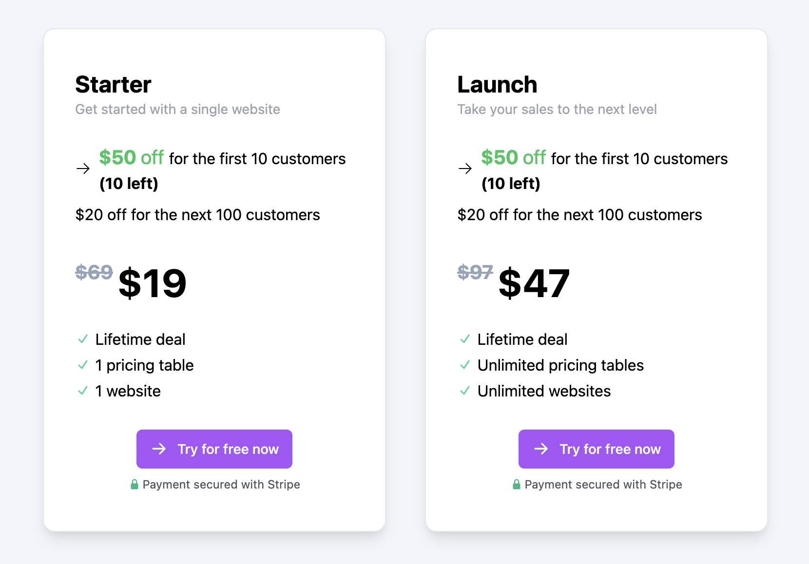 Use this component as the call to action on your pricing table. It will direct the customer to the Stripe checkout page with the active discount applied.